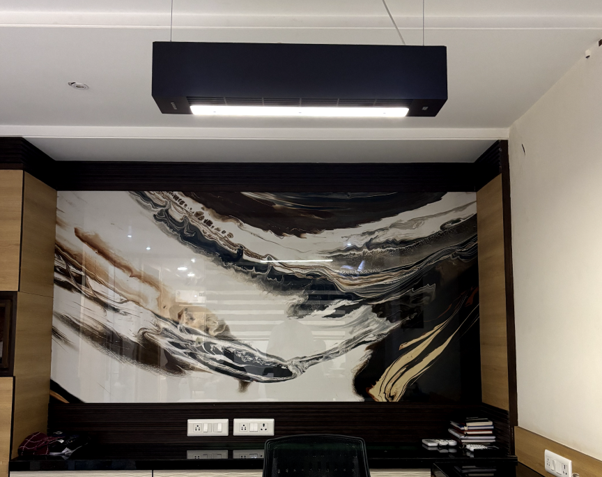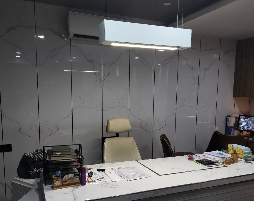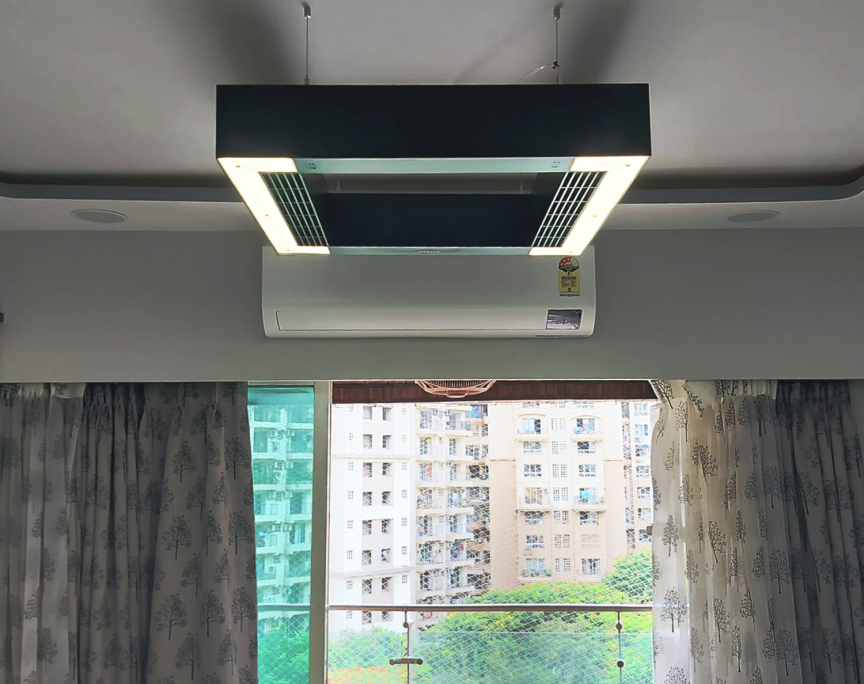 No more dealing with long pipes or hooks from the ceiling! Installation is a breeze with Airzone Lite, all you need comes in the box. The unit requires two chandelier wires, which are provided. If you’re installing on a concrete ceiling, a simple drill will do the job. For false ceilings, a cutout might be needed to hang the wires using plywood, which our trained partners at Urban Company can handle. Just book an installation through their app.